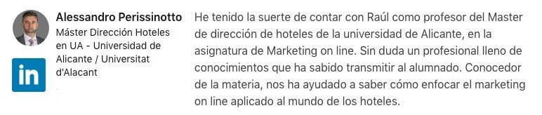 He tenido la suerte de contar con Raúl como profesor del Master de Dirección de Hoteles de la Universidad de Alicante, en la asignatura de Marketing Online. Sin duda un profesional lleno de conocimientos que ha sabido transmitir al alumnado. Conocedor de la materia, nos ha ayudado a saber cómo enfocar el Marketing Online aplicado al mundo de los hoteles.