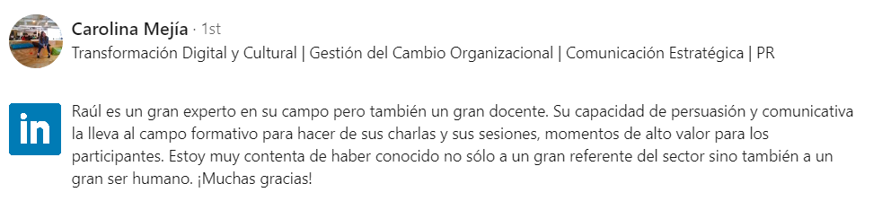Raúl es un gran experto en su campo pero también un gran docente. Su capacidad de persuasión y comunicativa la lleva al campo formativo para hacer de sus charlas y sus sesiones, momentos de alto valor para los participantes. Estoy muy contenta de haber conocido no sólo a un gran referente del sector sino también a un gran ser humano. ¡Muchas gracias!.