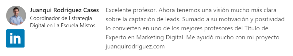 Excelente profesor. Sumado a su motivación y positividad lo convierten en uno de los mejores profesores del Título de Experto en Marketing Digital. Me ayudó mucho con mi proyecto.
