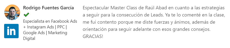 Espectacular Master Class de Raúl Abad. Ya te lo comenté en la clase, me fui contento porque me diste fuerzas y ánimos, además de orientación para seguir adelante con esos grandes consejos. GRACIAS!